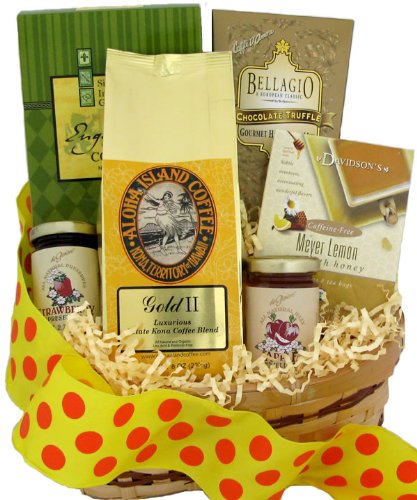 What a bright and cheery way to start the day! Our Kona Coffee Breakfast Gift Basket is filled with everything you need for a real treat for breakfast; what a great gift idea for newlyweds for that first breakfast together after their big day!Included in our Kona Coffee Breakfast Gift Basket is an 8 Oz package of our GOLD Luxurious Kona Coffee Blend (already ground, for the convenience of your gift recipient) and a big box of Meyer Lemon Herbal Tea and a box of Chocolate Truffle Cocoa. Also tucked into this delightful basket is a big box of gourmet English Tea Cookies and two jars of delicious fruit preserves (we even include a preserve knife so that your gift recipient can enjoy this gift immediately).Everyone loves our GOLD Luxurious Kona Coffee Blend and it is perfect for breakfast! With a very smooth texture and a well-rounded flavor profile, this wonderful, aromatic and delicious coffee is a great first-cup-of-coffee-in-the-morning. We handcraft this superb coffee with our 100% Pure Kona Coffee and our hand selected organic estate tropical coffee.We place all of these items in a lovely bamboo basket and carefully wrap the basket in cello and tie it with a great big cheery bow. This is a wonderful gift for any coffee lover!Christmas, All Occasion, Kona Coffee Breakfast Gift Basket from Aloha Island Coffee Feature