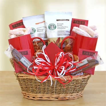 Send Valentine greetings to your favorite coffee lover with this gift of Starbucks coffee and sweet treats. Included in this lovely basket are two varieties of famous Starbucks coffee: French Roast and House Blend, two cheerful red ceramic mugs, Tazo tea, vanilla caramels, double chocolate biscotti and raspberry cookies.B006Y23LXQASIN