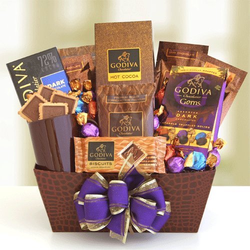 Nothing warms you up and satisfies the urge for chocolate like Godiva coffee and hot cocoa. Godiva chocolate crème coffee is made from the finest beans in the world, and is infused with chocolate crème for unsurpassed richness and aroma. Dark chocolate hot cocoa from Godiva is a luxurious way to warm up on a cold day. And, nothing goes better with Godiva coffee or hot cocoa than rich and creamy Godiva chocolate treats, like chocolate biscuits, Godiva milk chocolate gems and a 72% cacao dark chocolate bar.Godiva Gourmet Coffee, Cocoa and Chocolate Gift Basket Feature