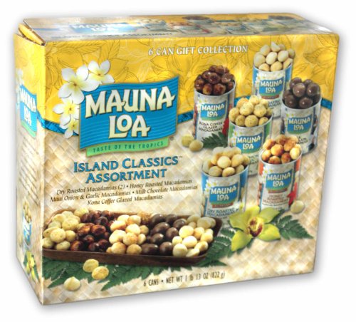flavored Mauna Loa Macadamia Nuts. This 6-can gift collection comes in a decorative island style box. This island treat is great for gatherings and is the perfect gift for all occasions. Includes (2) Cans Dry Roasted Macadamia, (1) Honey Roasted, (1) Maui Onion & Garlic, (1) Milk Chocolate and (1) Kona Coffee Glazed Macadamias.Mauna Loa Macadamia Nuts, Island Classics Assortment (6-Can GIFT Collection) Feature