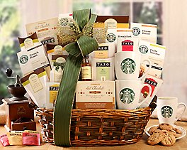 This gift is overflowing with coffee, tea and a selection of food to enjoy with friends, family or co-workers. Mild and flavorful Starbucks Breakfast Blend, crisp and sweet Caffe Verona and light and lively House Blend and flavorful Sumatra are paired with Starbucks Selects Brown & Haley cashew roca, almond roca, almond roca buttercrunch, white chocolate & raspberry cookies, hot chocolate salted caramel, hot chocolate marshmallow, a large assortment of Tazo teas and two Starbuck mugs. Gift Size: 18" x 11" x 11" - Item 623Starbucks Spectacular Feature