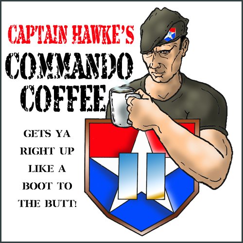 Ready for a Boot to the Butt? This is a unique blend of coffees that truly lives up to it's name. Intense, dark and smoky: a blend of gourmet Colombian, Guatemalan, and Sumatra coffees providing body and sharp acidity enveloped in a smoky flavored Italian Roast.Captain Hawke's Commando Coffee Feature