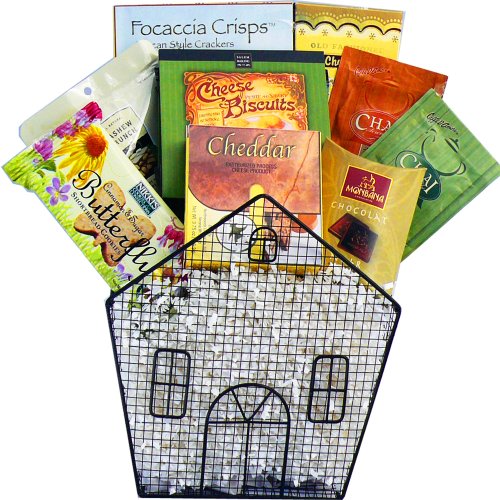 There's no taste like home... oh, we mean no PLACE like home! Our house-shaped wire basket welcomes your recipients home with an assortment of crunchy snacks and gourmet treats to enjoy: Italian seasoned Foccacia Crisp Crackers, Cheddar Cheese Spread, gourmet Tavalore Snack Mix, Artichoke Parmesan Cheese Biscuits, Peace Chai Tea, Joy Chai Tea, Cinnamon Shortbread Cookies, Chocolate Cream Puffs and Mobana Chocolate Noir. Each gift is hand crafted with attention to detail and includes a personalized gift card from you.An original gift basket arrangement designed by Art of Appreciation Gift Baskets™